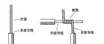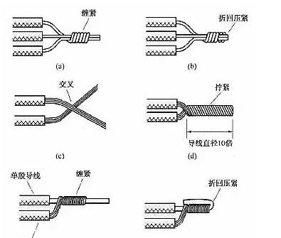 同一方向的导线的连接当需要连接的导线来自同一方向时,可以采用图5所示的方法对于单股导线,可将一根导线的芯线紧密缠绕在其他导线的芯线上,再将其他芯线的线头折回压紧即可对于多股导线,可将两根导线的芯线互相交叉,然后绞合拧紧即可对于单股导线与多股导线的连接,可将多股导线的芯线紧密缠绕在单股导线的芯线上,再将单股芯线的线头折回压紧即可。