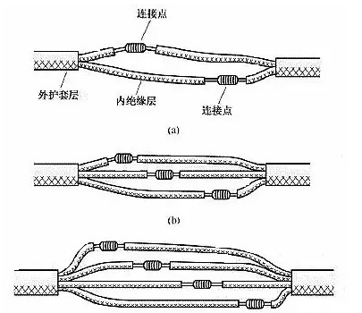 双芯或多芯电线电缆的连接双芯护套线三芯护套线或电缆多芯电缆在连接时,应注意尽可能将各芯线的连接点互相错开位置,可以更好地防止线间漏电或短路图6(a)所示为双芯护套线的连接情况,图6(b)所示为三芯护套线的连接情况,图6(c)所示为四芯电力电缆的连接情况。