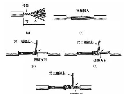 另一种方法如图3所示,将支路芯线靠近绝缘层的约1/8芯线绞合拧紧,其余7/8芯线分为两组[见图3a)],一组**干路芯线当中,另一组放在干路芯线前面,并朝右边按图3(b)所示方向缠绕 4~5圈再将**干路芯线当中的那一组朝左边按图3(c)所示方向缠绕4~5圈,连接好的导线如图3(d)所示。