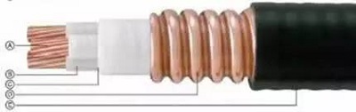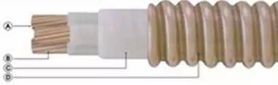 A. 导体:绞合铜导体;B. 绝缘:合成云母带;C. 填充:无机材料;D. 铜套:纵包焊接并轧纹
