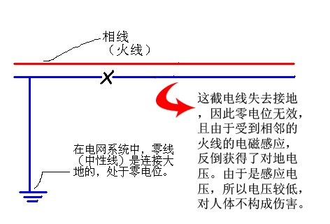 如果你光着脚踩在地上,用手触摸零线,这时你身体就相当于导体,电流从你身上流回大地,形成了回路,也就有了电压,就如上图零线的断点,此时零线和火线一样带220V电压,会造成人身触电事故。明白了这个原理,我们可以利用它来检修线路查出故障原因,一般一只电笔就可以了。