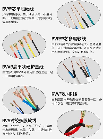 (1) 橡套软电缆:广泛应于各种电器设备。分为通用橡套软电缆,电焊机用软电缆,防水橡套电缆,潜水泵用扁电缆,无线电装置用电缆和摄影光源软电缆。