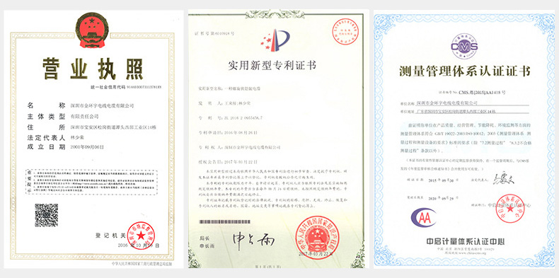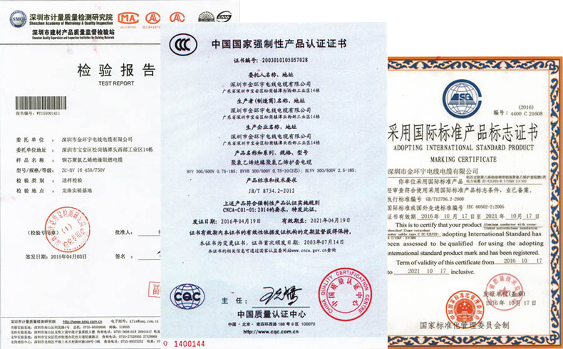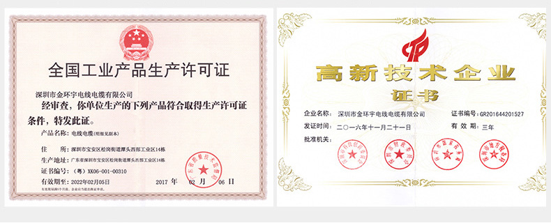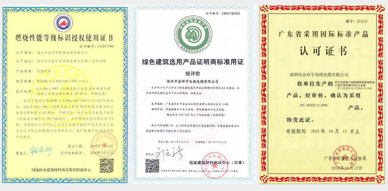 金环宇电线电缆自建厂年来,荣获国家质监局生产许可证、国家质检中心质量合格证、国家认证委员会“3C”强制认证及广东省质监局质管体系认证和广东省消防认证。